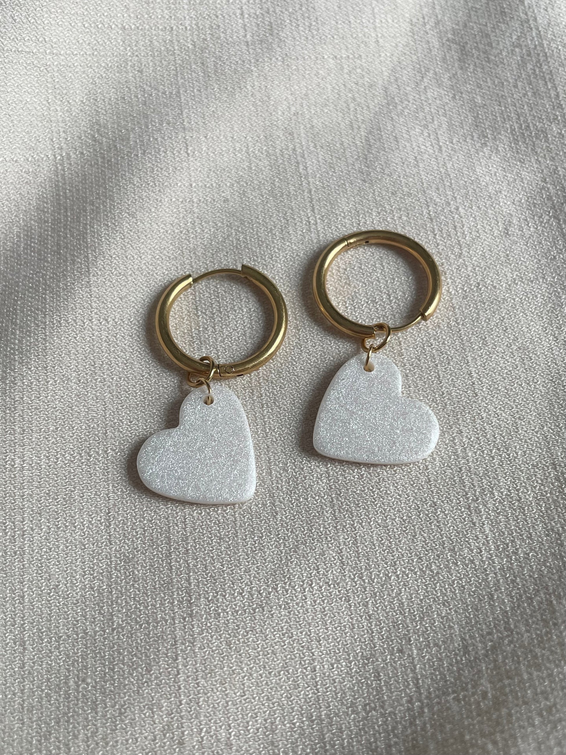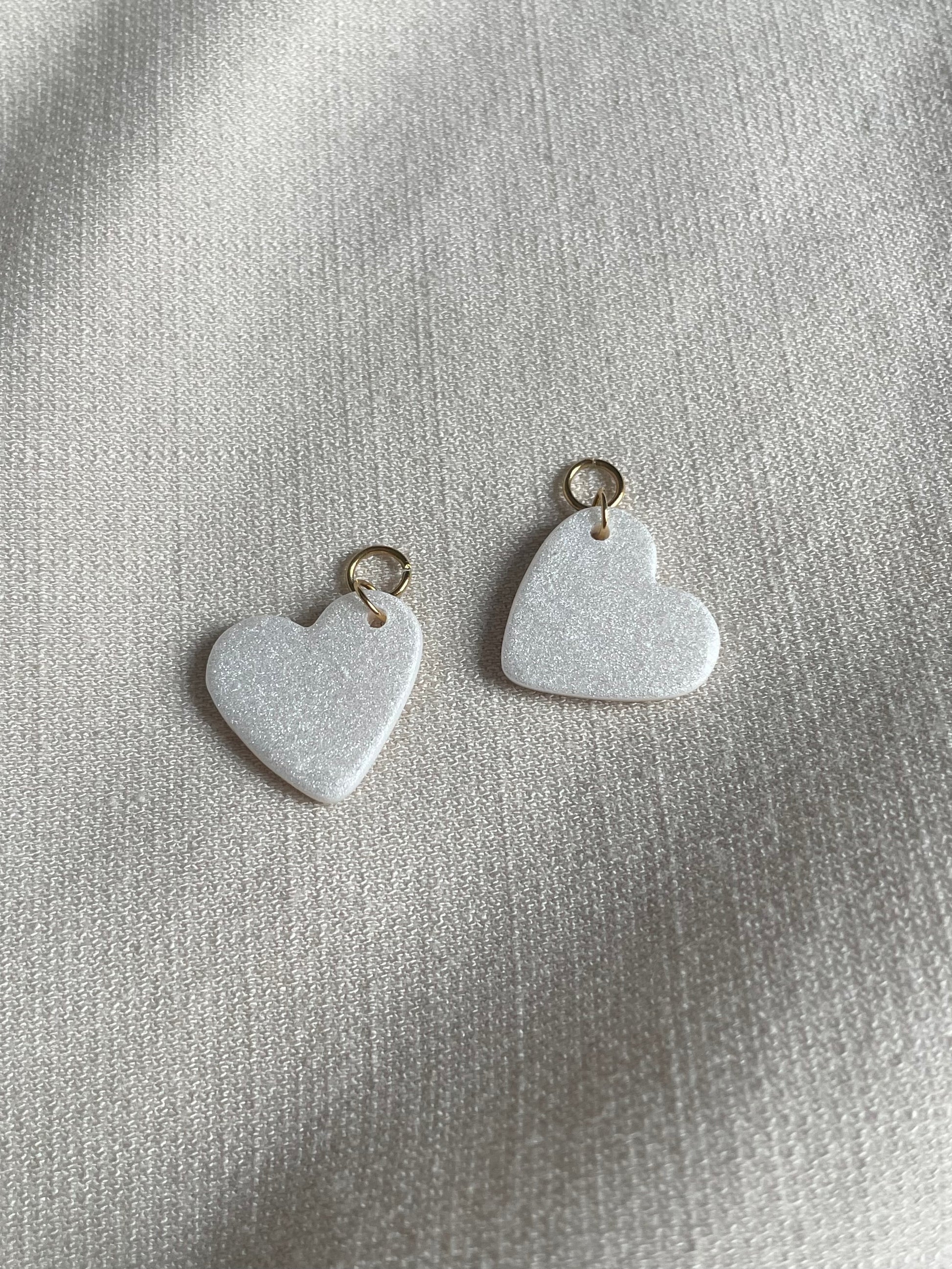2 cœurs blancs pailletés 100% faits à la main en argile polymère. Chaque modèle est unique ! 🫰💅